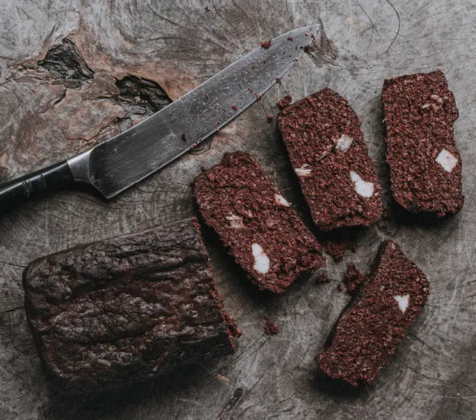 Hearty, traditional, and rich in flavor, our Black Pudding is handcrafted using fresh pig's blood from our native breed pigs, diced pork fat, gluten-free oats, a touch of cream, and a hint of cider brandy.